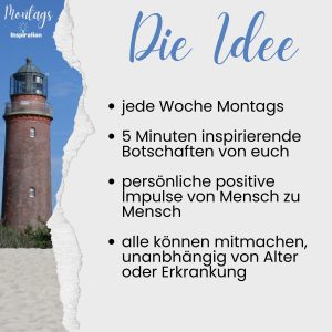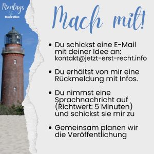 Hast du ein Thema, das dir am Herzen liegt und das eine Inspiration für andere sein kann? Vielleicht ein Lebensmotto, eine Erkenntnis, eine hilfreiche Erfahrung oder ein berührendes Erlebnis, was dich in deinem Leben weitergebracht hat? Dann bist du hier bei der Montags-Inspiration genau richtig.